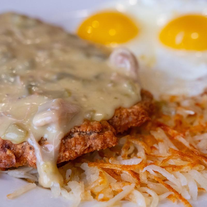 Two eggs, hash browns, and crispy chicken fried steak smothered with Frank Sr.’s creamy green chile chicken gravy or your choice of red or green chile. Served with toast or tortilla.