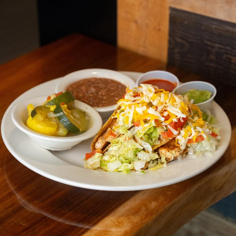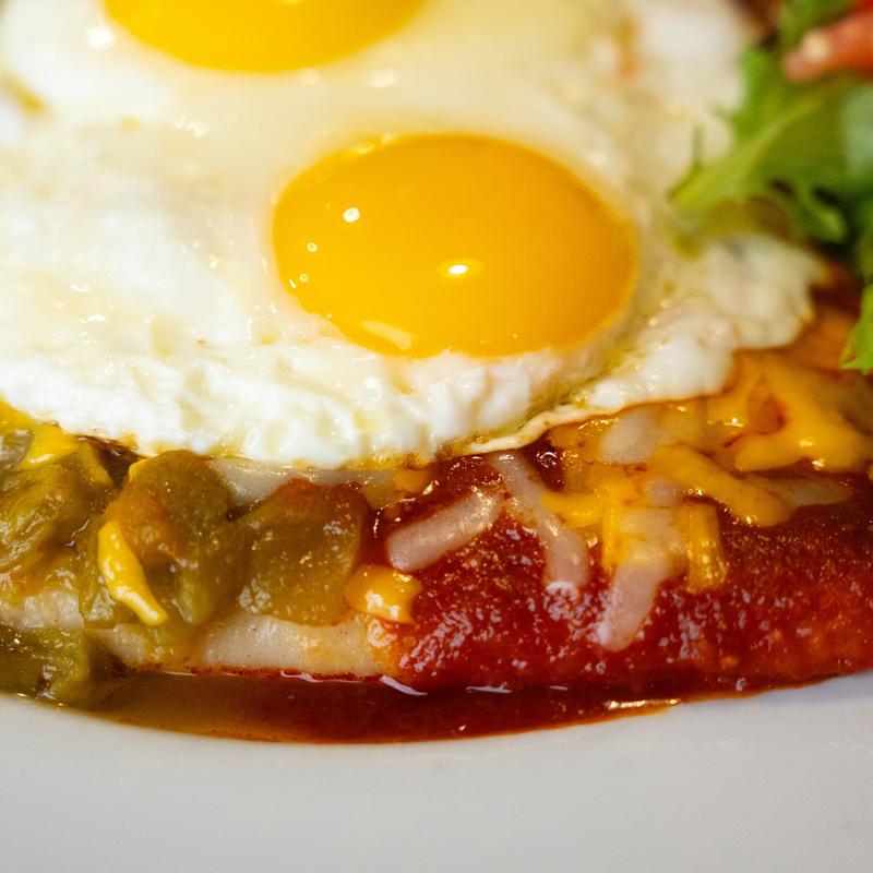 Three corn tortillas filled with cheese and topped with two eggs and melted cheese. Served with beans and hash browns and your choice of red or green chile.