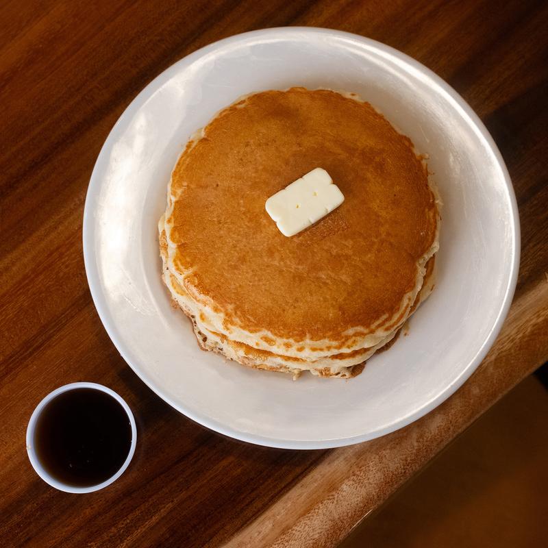 Three pancakes, two eggs, and sausage or bacon. Served with golden hash browns.